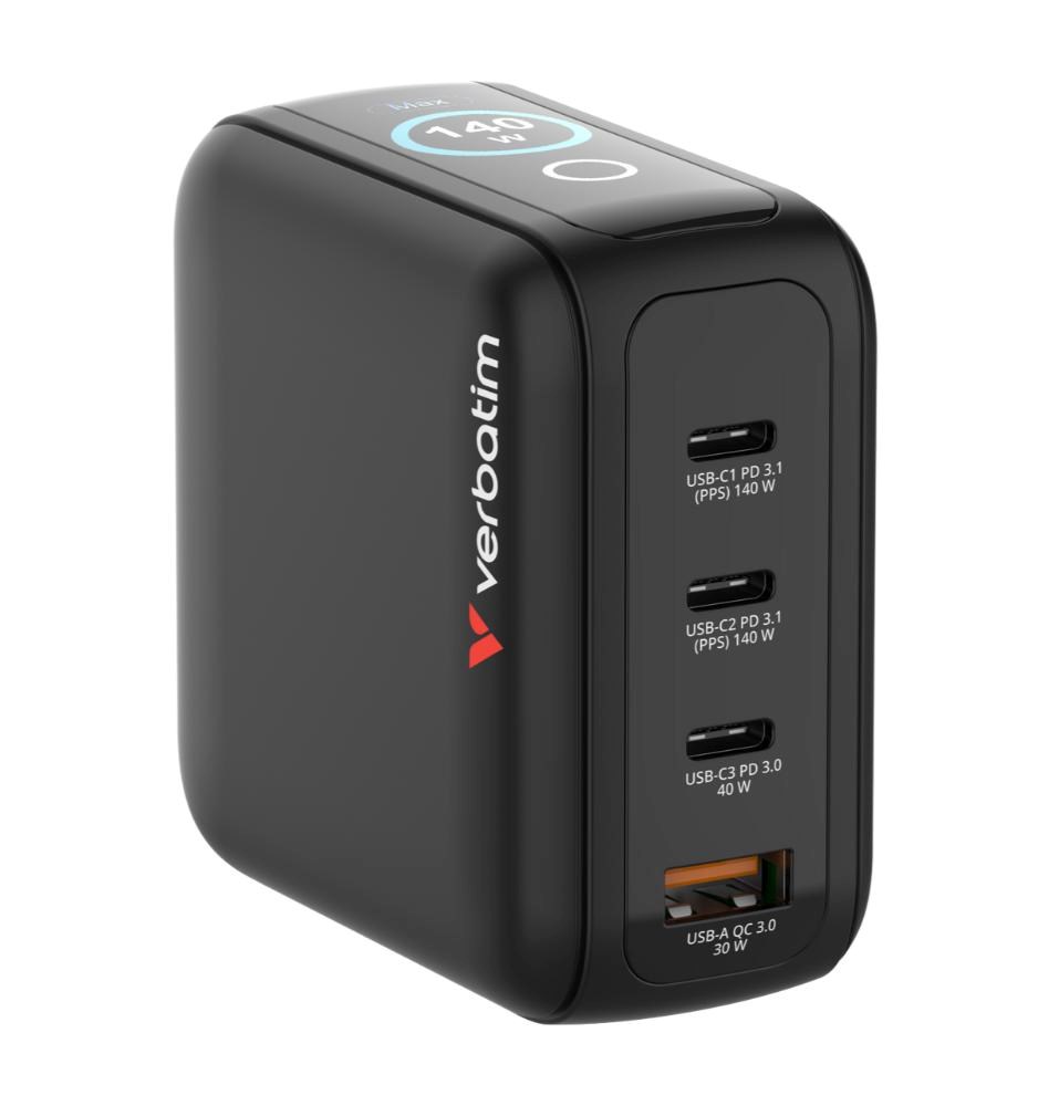 VERBATIM Mini GaN Nabíječka s displejem 140W, 3xUSB-C, 1xUSB-A, černá