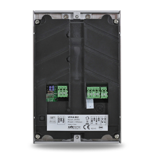 Vstupní kamerová jednotka VERIA 802 je určena pro 2-vodičové systémy domácích videotelefonů VERIA série 2-WIRE. Vstupní barevná kamerová jednotka VERIA 802 v elegantním kovovém anti-vandal provedení určená pro domácí videotelefony VERIA.