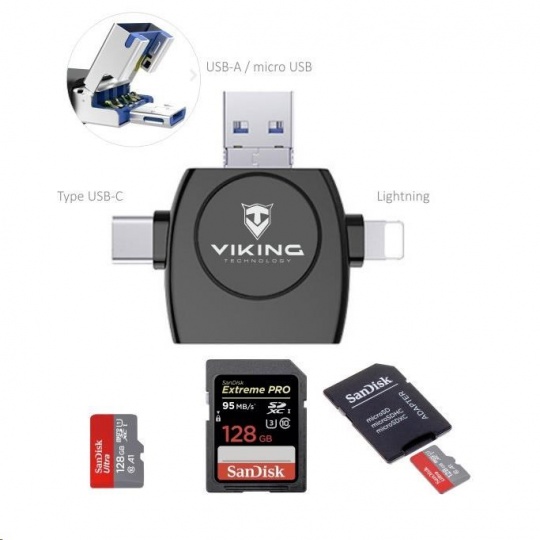 VIKING ČTEČKA PAMĚŤOVÝCH KARET V4 USD3.0 4v1 S KONCOVKOU APPLE LIGHTNING/MICRO USB/USB/USB-C