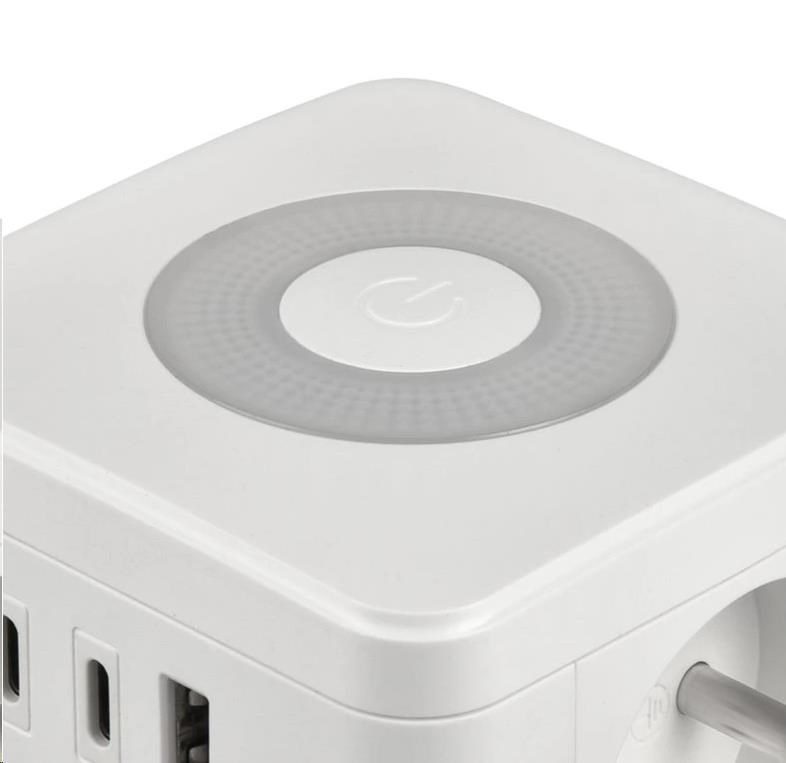 Síťový adaptér VIKING YC23L nabízí pohodlné a efektivní napájení až pěti zařízení současně díky dvěma AC výstupům a třem USB portům. S dotykovým světlem se třemi intenzitami svícení a kompaktním designem je ideální pro domácnost i kancelář.
