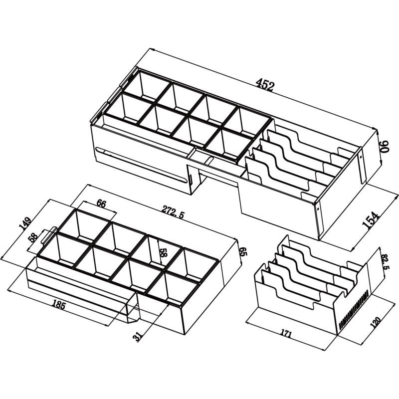 - Vyjímatelný kovový zásobník na bankovky s plastovými oddělovači přihrádek
