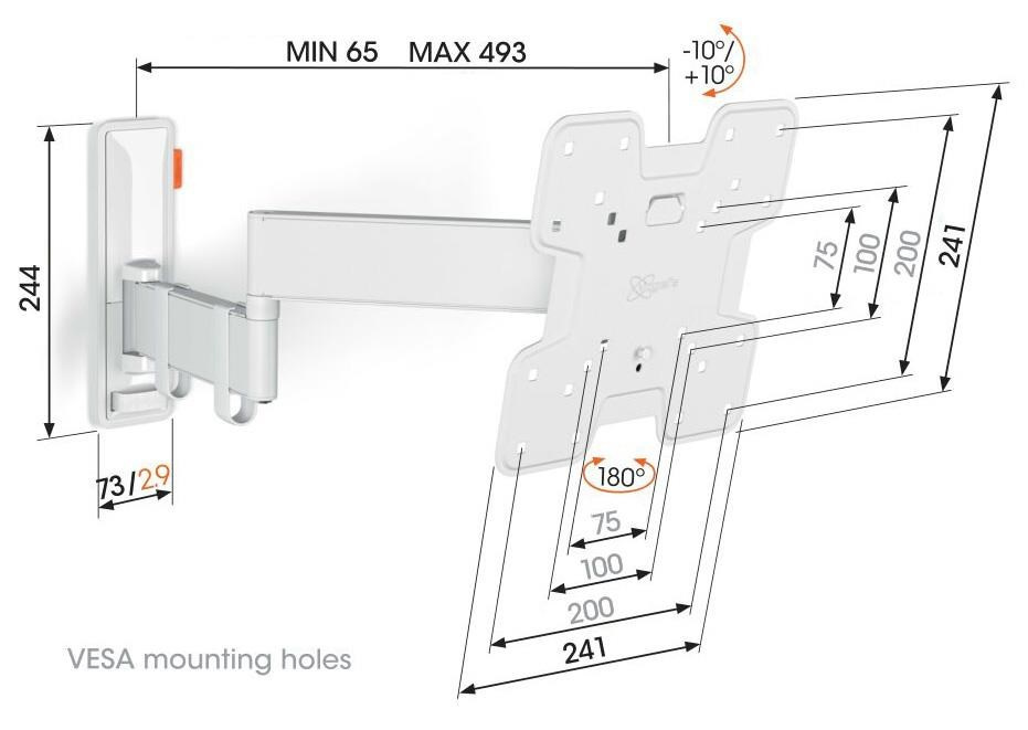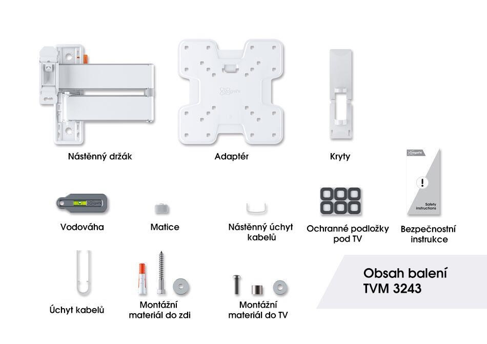 TVM 3243 je stylový nástěnný TV držák řady COMFORT Full-Motion+ a volíte s ním bezpečnost, design a optimální pohodlí při sledování. Držák je velmi robustní a vydrží intenzivní používání. Protože se může otáčet až o 180°, můžete si sledování TV vychutnat z jakéhokoli úhlu v místnosti. Naklápění je možné až do úhlu 20° (10° nahoru a dolů). TVM 3243 je vhodný pro televizory s úhlopříčkou od 19 do 43 palců a hmotností do 15 kg.