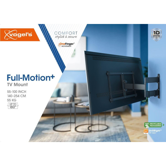 S tímto stylovým nástěnným držákem řady COMFORT Full-Motion+ si můžete sledování svého velkého televizoru maximálně užít. TV 3843 se může otáčet až o 180° a naklánět až o 10° pro optimální pohodlí při sledování. Je navržen pro intenzivní používání, takže je ideální pro rodiny s dětmi. Váš televizor bude zaručeně bezpečně a spolehlivě upevněn. Držák je vhodný pro televizory s úhlopříčkou 50 až 100 palců a hmotností do 55 kg.