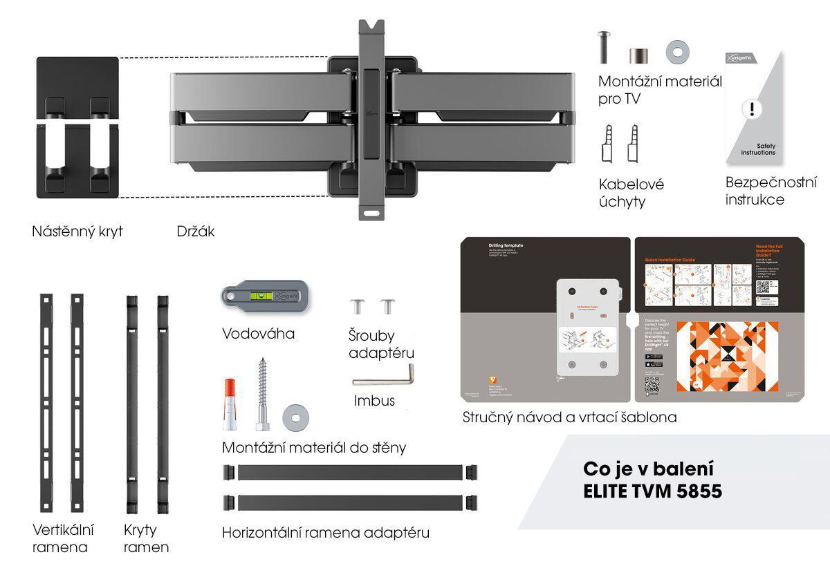 - DrillRight™ AR aplikace a vrtací šablona v balení pro maximální usnadnění montáže, pomocí mobilního zařízení zobrazíte polohu vaší TV na stěně a můžete označit první vrtací otvor pro montáž držáku