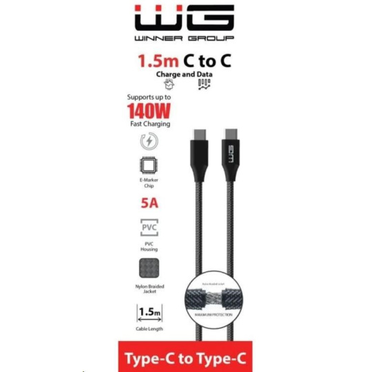 WG - Datový kabel Type-C na Type-C, 1,5 metrů, 5A, 140W, černá
