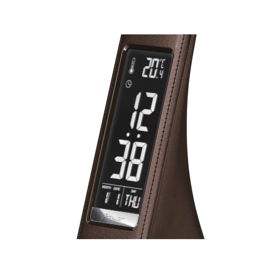 Kožená stolní LED lampa hnědé barvy s ohebným ramenem, které zajistí osvětlení požadovaného místa. Rovnoměrné a jemné světlo, které šetří oči. Nastavitelný jas ve třech úrovních. Citlivý dotykový panel pro snadné ovládání. Součástí lampy je displej s vysokým rozlišením, kterým zobrazuje hodiny, budík, kalendář, teplotu.