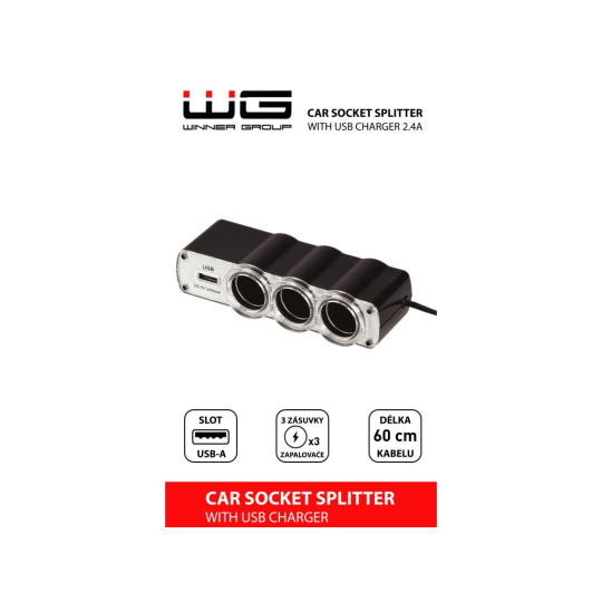 WG - Nabíječka do auta, rozbočovač, 3x zásuvka zapalovače 12V + 1x USB-A, s prodloužením