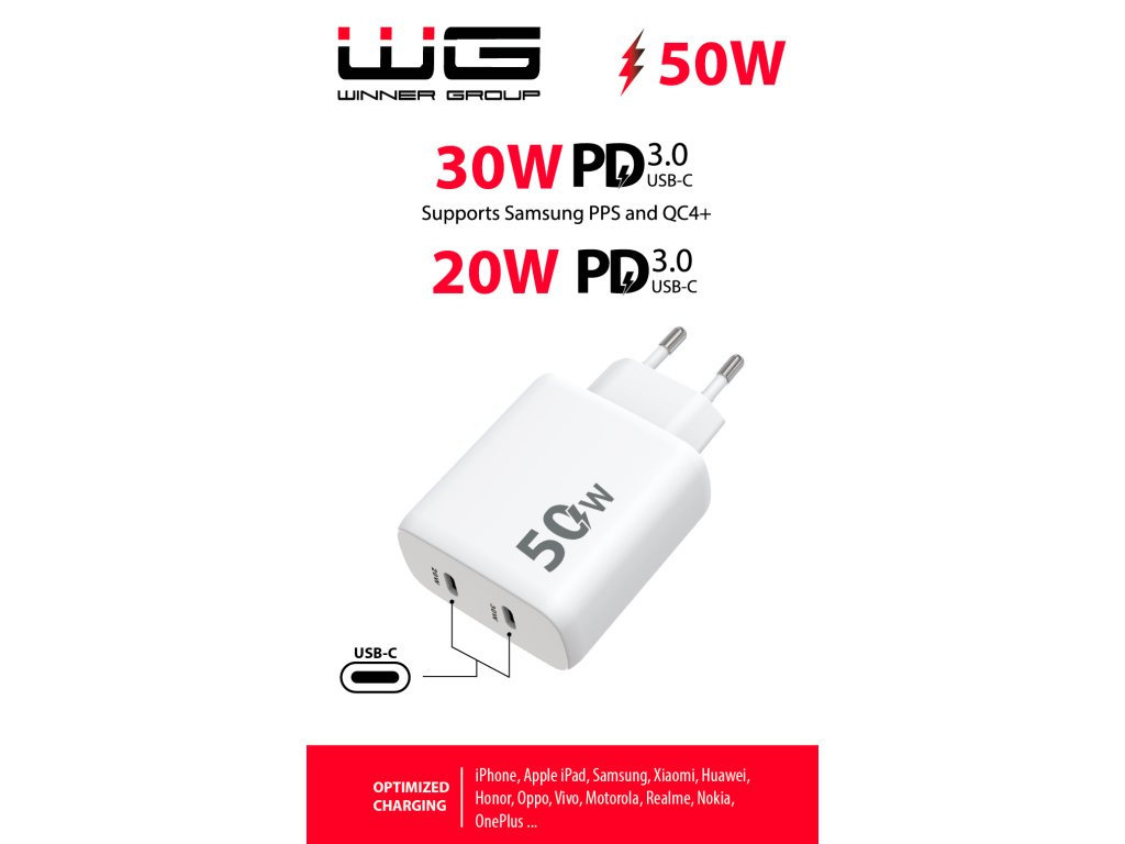 WG - Síťová nabíječka 2x USB-C 50W, 1x USB-C PD 30W + 1x USB-C PD 20W, bílá