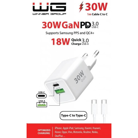 WG - Síťová nabíječka GaN 2x USB 30W, 1x USB-C PD3.0 PPS QC4 30W + USB-A 18W, kabel Type-C na Type-C, bílá