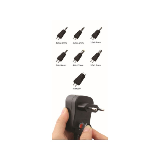 Vyměnitelné koncovky: 2.35 x 0.7mm, 3.5 x 1.35mm, 4 x 1.7mm, 5 x 2.1mm, 5.5 x 2.5mm, 5.5 x 2.1mm, Jack 2.5mm, Jack 3.5mm, Micro 5P, 2.5 x 0.7mm, 3 x 1mm, 4.8 x 1.7mm, 5.5 x 1.5mm.