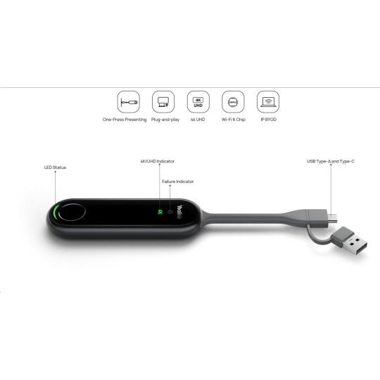 Yealink PA20 je nový 4K Ultra HD prezentační asistent. Díky hardwarovému streamování UHD až do 4K/30FPS šetří PA20 spoustu úsilí tím, že eliminuje nutnost instalace softwaru nebo ovladačů. Port USB typu A / plně vybavený port USB typu C je vhodný pro různé počítače a telefony. Protože PA20 má vestavěný software pro asistenta prezentací a čip Wi-Fi 6, jednoduše zapojte PA20 do zařízení a můžete být rychle připraveni prezentovat. PA20 vám poskytuje pohodlnější a bohatší zážitek ze sdílení obsahu.