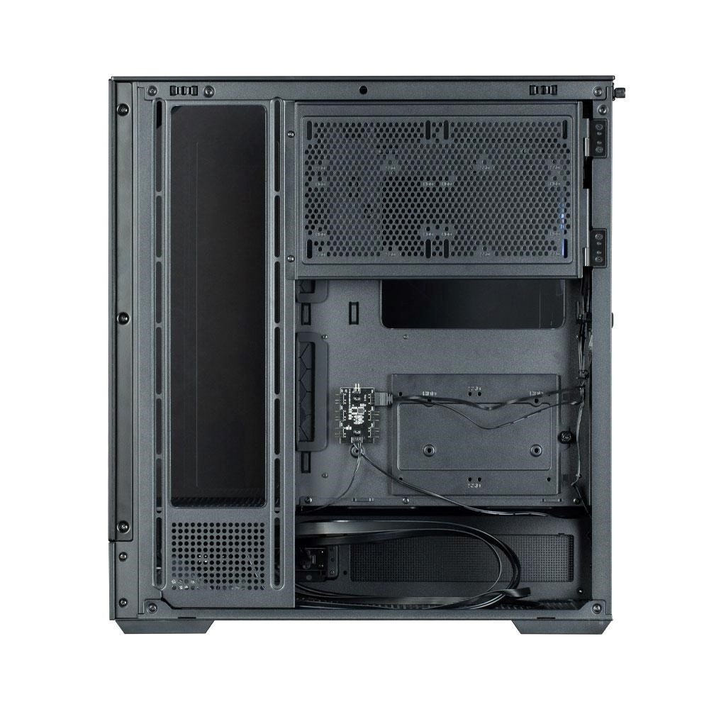 Pocitově odstraňuje rám skříně a poskytuje pocit otevřenosti a volného výhledu. Panely z tvrzeného skla na přední straně, bocích a horní části vytvářejí dokonalý vzhled.
